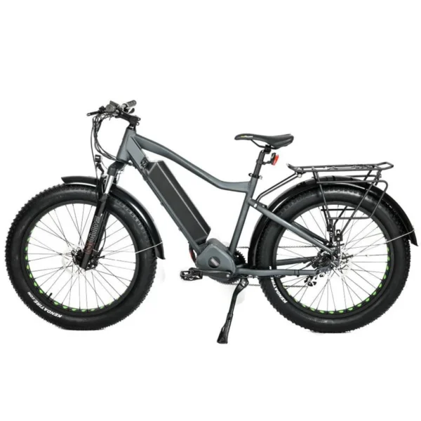 The EUNORAU FAT-HD is one of the more powerful production eBikes on the market today. Built entirely around the Bafang BBSHD 1000w motor.On the features list we have the two height pannier rack has a wide plate and the spring tensioned arms for holding small, pliable items, and the metal fenders are a great plus.Metal fenders stay in place much better, especially when encountering loose and packed terrain such as mud. The strong 13ga spokes are well fitted for the size and torque of the system, and the wheel punch-outs make for a great look on the bike overall.And it is equipped with fat tires, front suspension and a hefty battery to help it power through the mud, snow, sand and pretty much anything else you can throw at it.