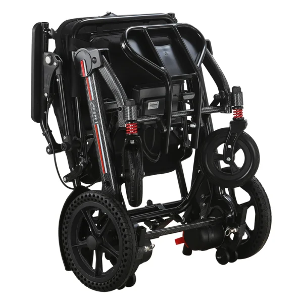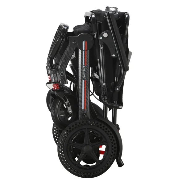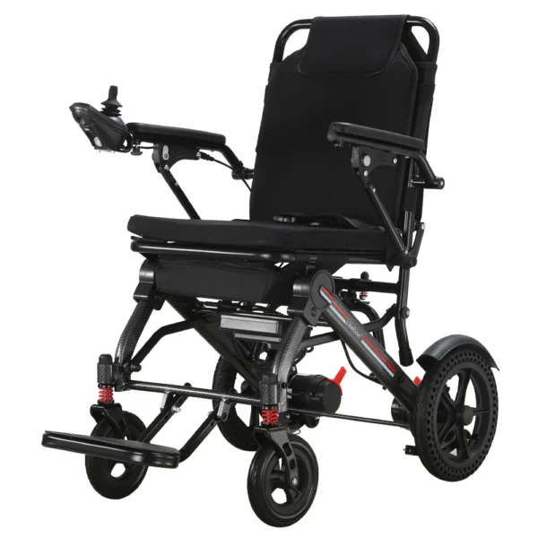 The LiteRider is ultra stylish, too. Painted in a gloss carbon fibre with red accents and black upholstery, this is a sleek machine that looks more impressive than standard aluminium chairs.