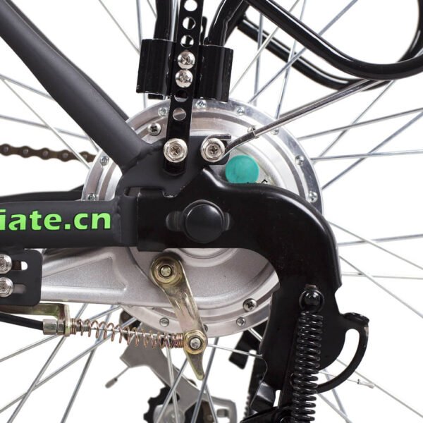 Driven by a 250W/350W rear-hub motor with both throttle and cadence-based pedal assist, features a 36v 10a lithium battery and easy-to-use controls 6-speed Shimano derailleur, 14-18 tooth cassette with a 44 tooth chainring in the front, V brake in the front and drum brake in the rear.