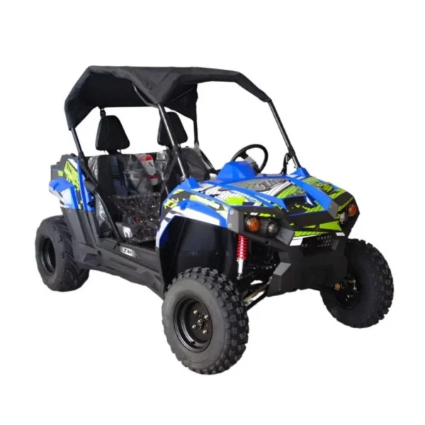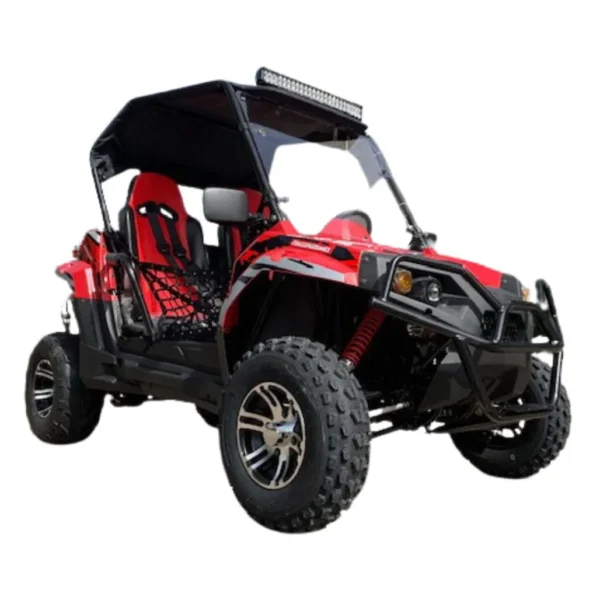 Put the kids in the driver’s seat with the TrailMaster 200cc Challenger Side x Side UTV! It’s designed to be just the right size for youth! It even has an adjustable steering column and reverse! Plus, there’s a full upper brush guard complete with sunshade canopy for all day riding, side protection rails with heavy-duty nylon safety nets and dual seats with seat harnesses to help keep kids safe while riding.  The Challenger is powered by a reliable, electric start 4-stroke engine, automatic CVT transmission and chain driven dual rear wheel drive. Stopping is extra firm thanks to 4-wheel hydraulic assist disc brakes, and the full suspension system and all-terrain tires help the Challenger crawl over the toughest trails.