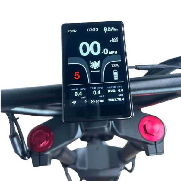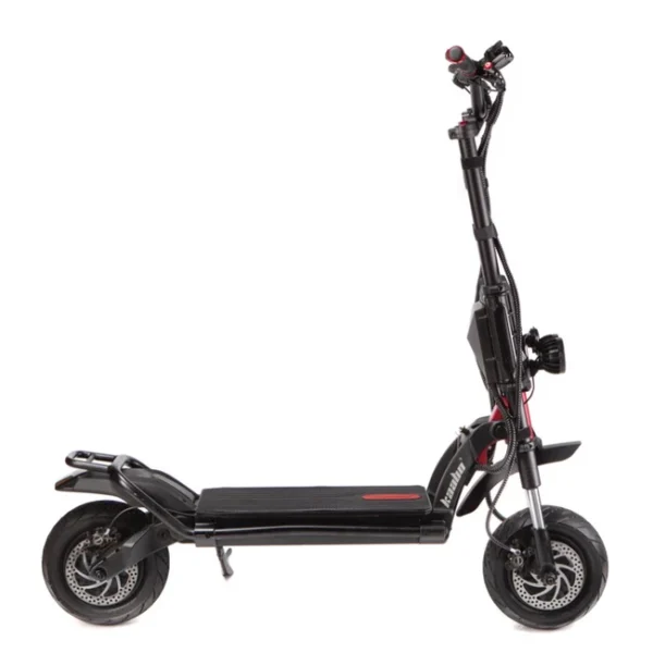 On paved road, this high-performance scooter delivers insane acceleration and a top speed of 50mph (road tires recommended for high-speed road use). The huge 60V 35Ah LG or Samsung battery can last for up to 60 miles under optimal conditions, but also delivers sufficient range for those thrilling high speed rides. Full hydraulic brakes in combination with the optionally enabled ABS system provide for safe and accurate braking power to tame this beast.